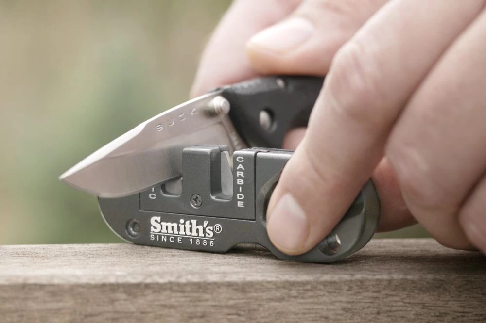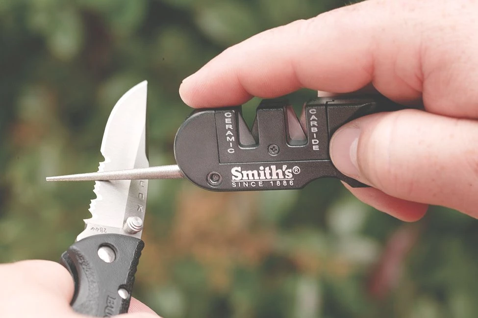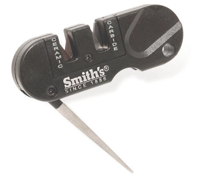 Smith’s Pocket Pal Multi-Functional Knife Sharpener features pre-set crossed carbides and ceramic stones, which provide the “Perfect Edge” every time.
