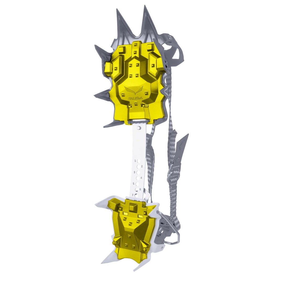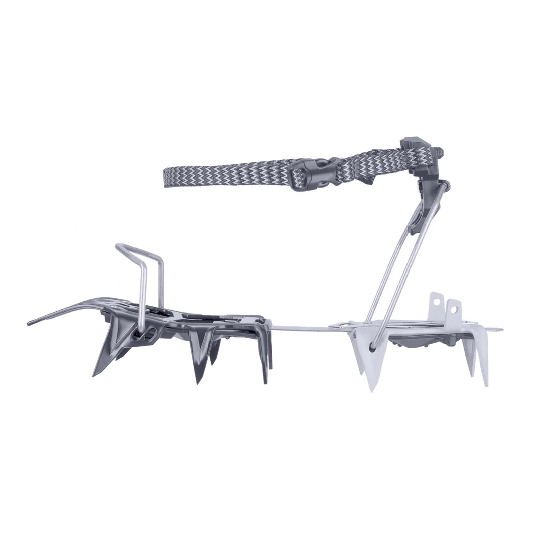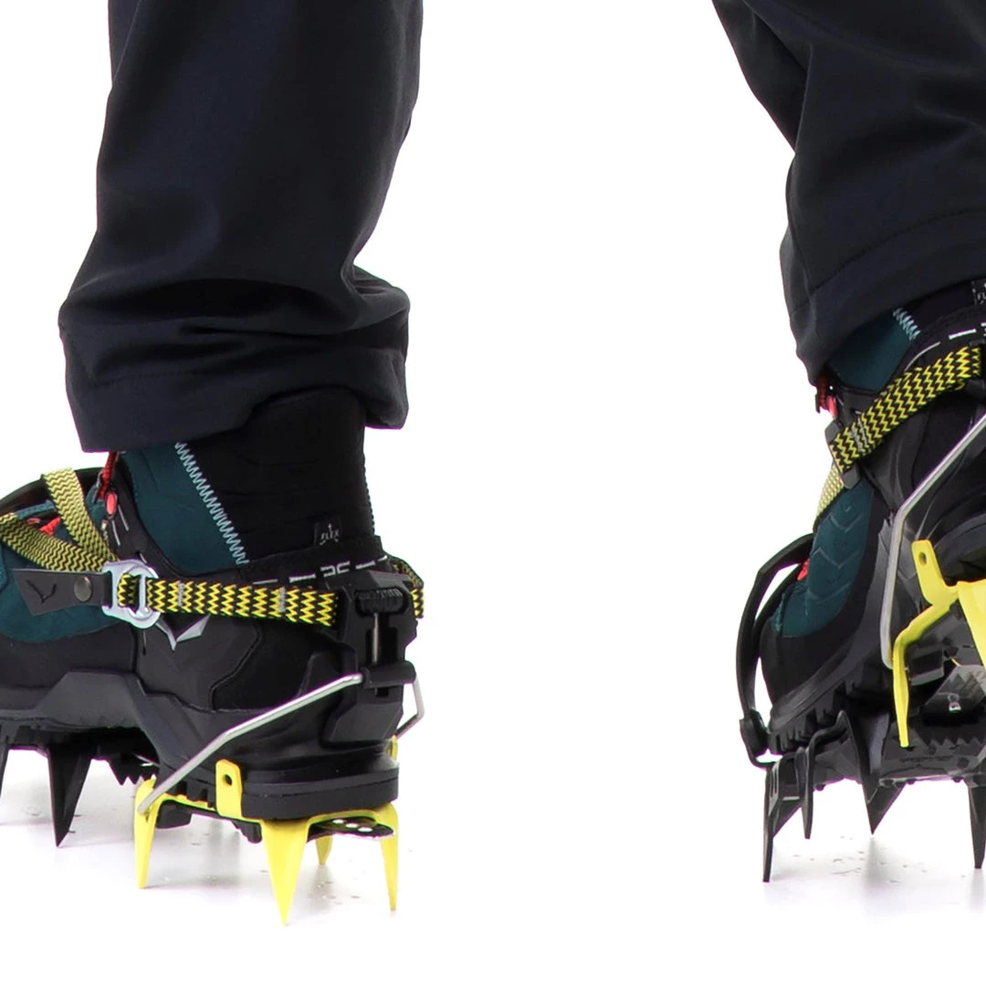 The Salewa Alpinist Combi is a versatile, robust stainless steel hybrid crampon for technical ice climbing, mixed routes and general mountaineering. Its carbon steel, 3D section frame construction has a strong and light clip design and a front basket to accommodate boots without a toe welt. The horizontal front points provide reliable purchase and load transfer on waterfall ice and horizontal rock edges. The overall geometry and semi-aggressive secondary points are engineered to provide a better grip on ice and in snow, while the extra mid-foot spikes offer additional security on verglas ridges and ice rime. In addition to the strong and light design, what really sets this semi-automatic crampon apart are its unique length-adjustable straps – no more loose ends. They significantly reduce the risk of stumbling. The flexing studded anti-balling plates, which seal the entire under surface minimize snow build-up. The low-profile heel bail ensures a secure fit, while the micro-adjust wheel is still simple to operate when gloved up. With no tools required, it’s also quick and easy to adjust in the field.