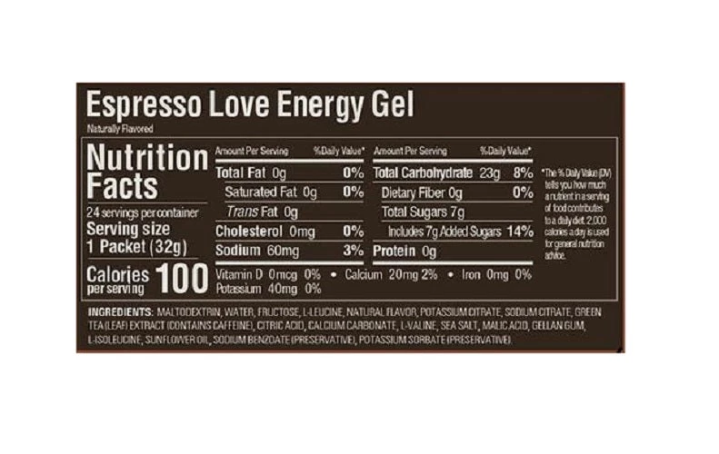 Created for daily training and competition, GU Energy Gel packs energy-dense calories in a portable packet to help sustain energy demands of any duration or activity. The 100-calorie packet contains carbohydrates (maltodextrin and fructose) that use non-competing pathways to help maximize carbohydrate absorption and utilization while diminishing stomach distress. Sodium, the primary electrolyte lost in sweat, aids in hydration by maintaining water balance. The branched-chain amino acids (leucine, valine, isoleucine) may reduce mental fatigue and decrease muscle damage.