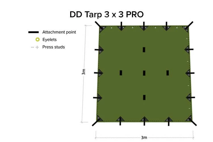 – 21 reinforced attachment points (2 more than the DD Tarp 3×3) allow for the Tarp 3×3 Pro to be set up in countless ways.