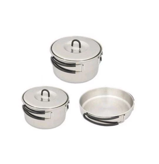 Five-part cooking set with folding handles. Comprises of a pan with folding handles and two pots with folding handles and lids.