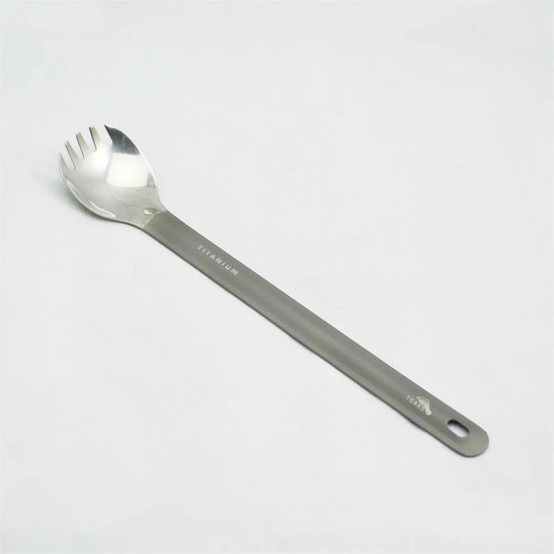 1. Ultralight titanium spork with matte finish handle and polished bowl. Long handle and spork head make it easy to reach bottle of freeze dried meals and stick or scoop out those last little morsals.