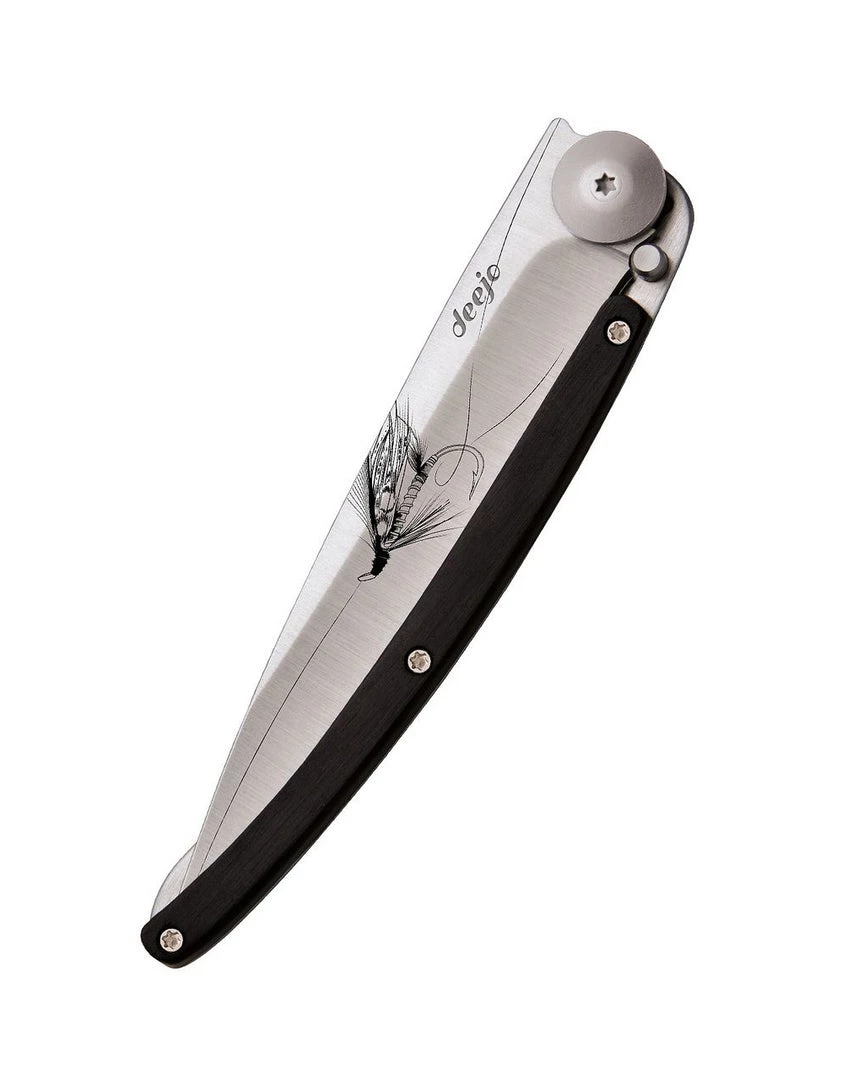The fly fishermen will immediately recognize themselves in this original creation through which Deejo wishes to pay homage. Ebony wood, visually appreciated for its deep blacks, possesses the particularity of being virtually insensitive to humidity. This species of wood is thus the densest, the most resistant, and the most precious, ideal for this magnificent piece of cutlery.