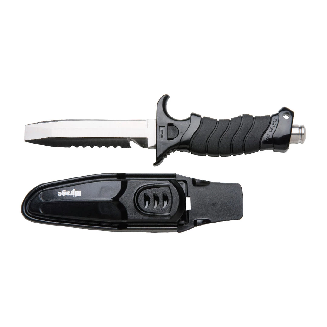 The versatile Samoa Blunt Tip knife from Mirage boasts a serrated blade with line cutter and a chisel tip perfect for collecting Paua.
