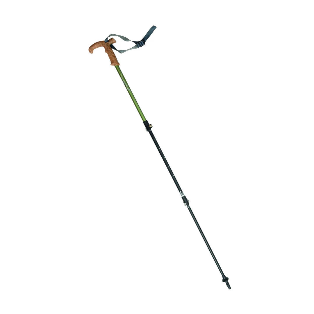 Single, lightweight walking pole with easy lever locks and traditional walking stick handle.