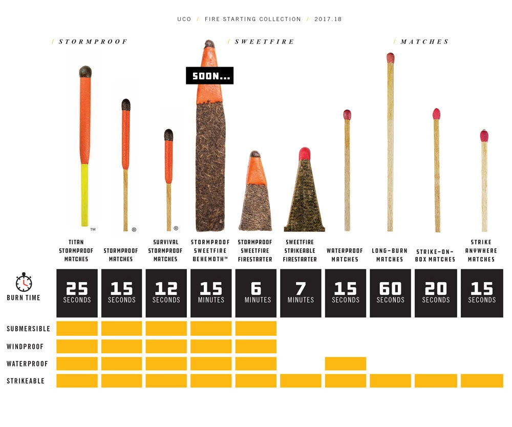 Stormproof means that it will relight after being submerged in water. The advantage of the sweetfire over a normal waterproof or stormproof match is that it includes tinder in the ‘point’. Light the ‘point’ just like a match and it will burn for 7 mins to help you start a fire like a boss. Go prepared!
