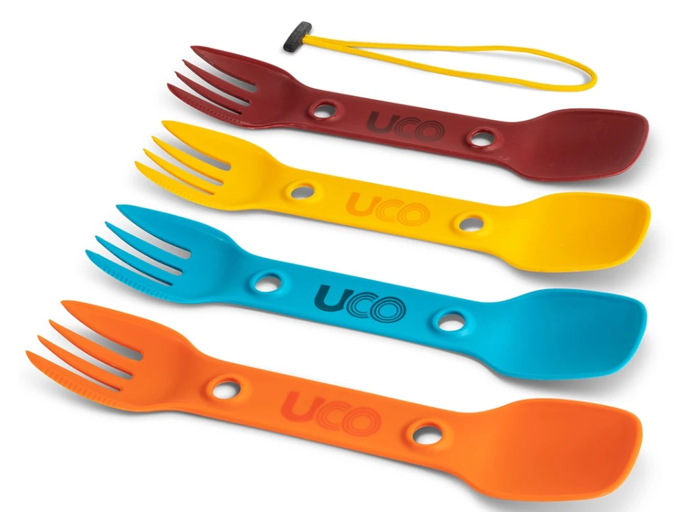 Functionality. The utensils you eat with should just work. Often referred to as “three in one”, the Utility Spork is anything but a compromise. Micro serrations smoothly cut through protein rich foods and stab the perfect bite. Those holes aren’t just for weight reduction. Each Spork Set includes a Reusable Tether which can be clipped to a bag, used to hang dry, or stack and cinch multiple utensils together for transport.