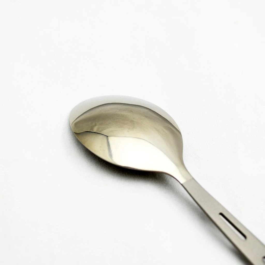 Ultralight titanium spoon with polished bowl. Flat head make it easy to reach the corners.