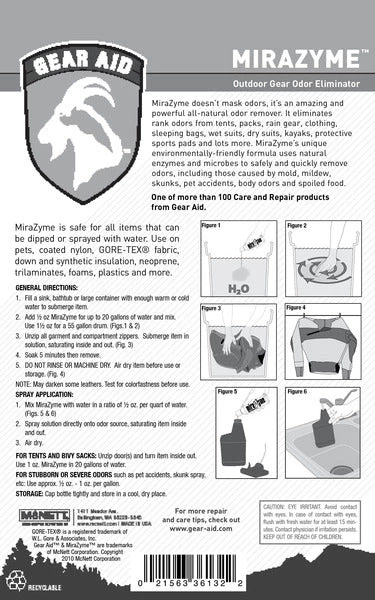 When washing just isn’t enough, you need the odor eliminating power of MiraZyme™ by Gear Aid™. Rather than hide or mask bad odors, MiraZyme utilizes a natural blend of microbes to safely remove the bacteria causing the odour.