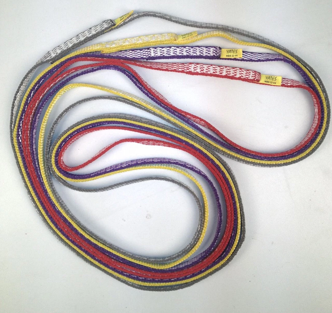11mm Dyneema Webbing: “Dyneema” webbing consists of a blend of Dyneema and Nylon fibers woven together to form a webbing that has superior properties. The bonus of Dyneema fiber is that it is stronger, lighter and absorbs less water compared to Nylon. The down side of Dyneema is that it melts at a much lower temperature than Nylon. Yates have developed an exclusive weave pattern for their 11mm and 14mm Dyneema webbing that maximizes the benefits of both fibers. Their weave pattern has been shown to be superior in abrasion and snagging tests. Their Unique Nylon edge weave eliminates Dyneema fibers snagging on crystals and “pulling” from the webbing!